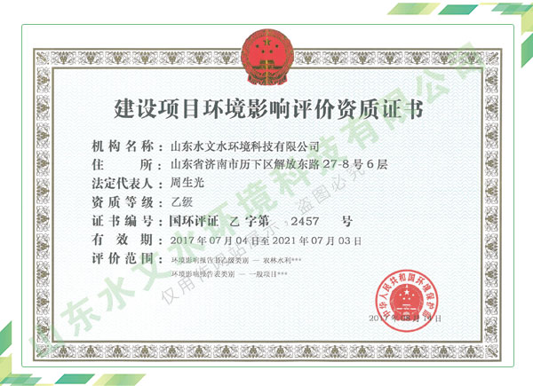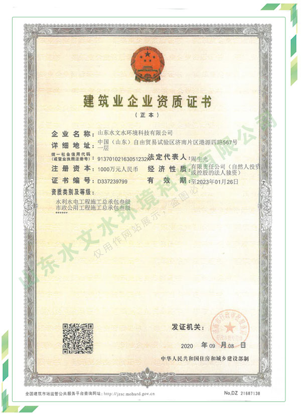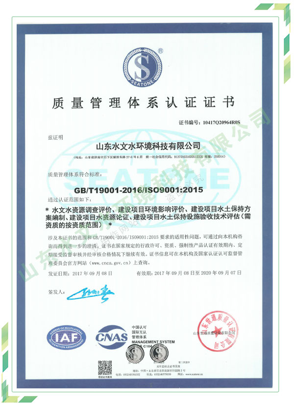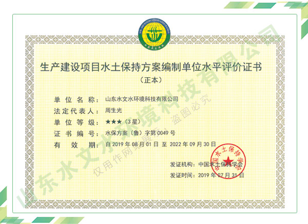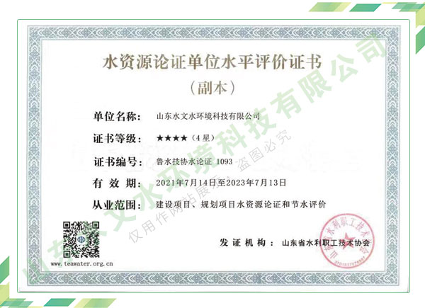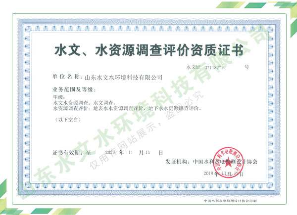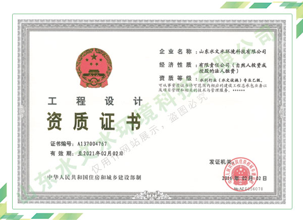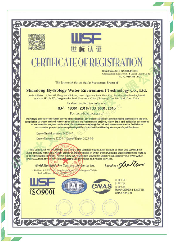 公司擁有水利工程設計、水土保持、水文水資源調查評價、水資源論證、建設項目環(huán)境影響評價、市政公用工程施工總承包、水利水電工程施工總承包、電子與智能化工程專業承包等資質,2017年通過質量管理體系、環(huán)境管理體系、職業健康安全管理體系認證;2020年被評為國家級高新技術企業,同年被中國水利企業協會推薦為第一批“合同節(jié)水服務企業”;2021年被山東省、濟南市評為 “專精特新”中小企業。業務范圍涉及水利工程設計;節(jié)水設計、改造、水平衡測試;山洪災害調查;城市水資源調查評價;建設項目水土保持方案編制、監(jiān)測、驗收、水土保持規(guī)劃;水安全保障規(guī)劃、建設項目水資源論證、規(guī)劃水資源論證;建設項目環(huán)境影響評價;入河排污口論證;防洪影響評價;市政公用工程施工、水利水電工程施工、電子與智能化工程施工等。